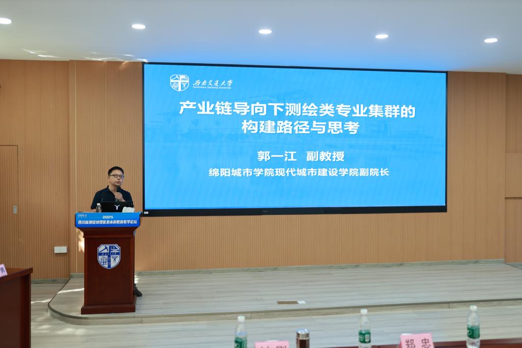 8月12日,“2025四川省测绘地理信息教育论坛”在西南交通大学峨眉校区顺利召开。本次论坛由四川省测绘地理信息学会、四川省地理信息产业协会主办,西南交通大学、四川省测绘地理信息学会教育与科普工作委员会承办,绵阳城市学院与西南科技大学、西南石油大学等多所院校共同协办,吸引了全省43所大中专学校、21家企事业单位的90余名代表参会,围绕“师德师风建设、学科建设、专业建设、高素质人才培养”核心主题,共探测绘地理信息教育改革与人才培养新路径。绵阳城市学院现代城市建设学院副院长郭一江副教授受邀参会,并在下午本科教育分论坛作专题报告,以产业链导向为核心,分享学校测绘类专业集群建设的创新经验,引发广泛关注。