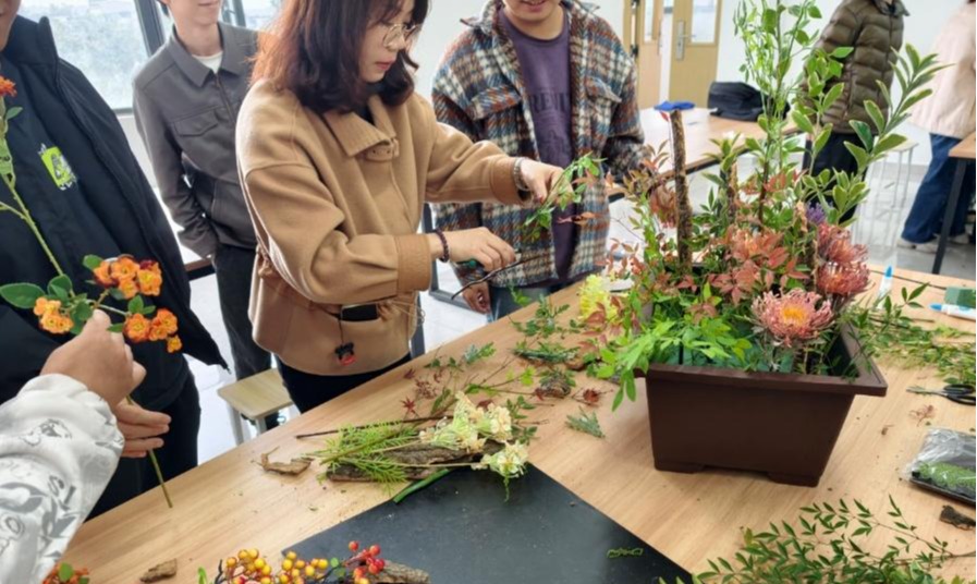 此次课程创新教学活动,以“花语空间”为载体,让学生在“文化溯源——实操创作——交流升华”的过程中,既解锁了花艺设计技巧,又深化了对景观小品“源于自然、服务生活”的理解,为《景观小品设计》课程的教学创新积累了鲜活经验,也为学生后续的设计实践注入了“人文+艺术+实用”的创意养分。