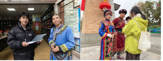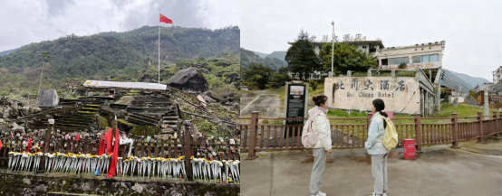 调研实行"双导师"制度,教师把控技术路线与成果规范,地方规划专家现场讲解用地布局、安全避让、风貌管控等治理要点。在老县城地震遗址,师生沿指定路线记录震前道路网络、建筑损毁梯度及地形地貌,结合震前地图还原空间格局,现场默哀体悟科学选址与抗震设防的重要性;随后赴新北川永昌镇,利用高精度定位设备采集羌族碉楼、吊脚楼、巴拿恰商业街立面等文化要素POI坐标,并访谈管理部门,解析文化符号与商业空间、产业载体的融合逻辑,实现"数据-空间-政策"闭环认知。