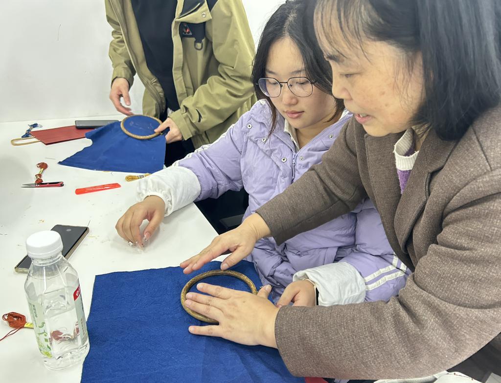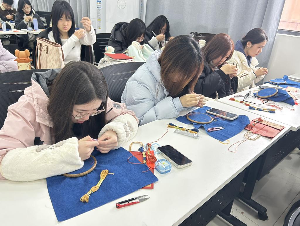 在实践环节,两位传承人手把手教授羌绣基本针法与创作技巧,同学们亲手绘制图案、穿针引线,完成一件件独具特色的羌绣小样。课程指导教师何老师也同步介绍了羌绣的发展脉络与文化价值,加深学生对非遗保护与创新应用的理解。