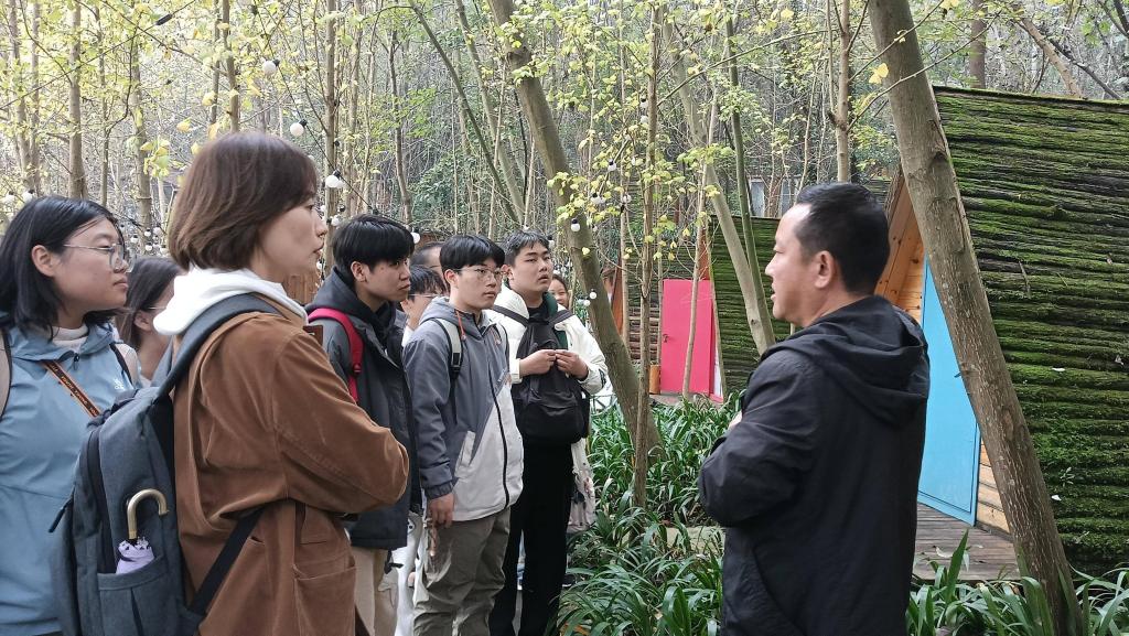 在桂家湾研学基地,绵阳市旅游协会研学分会会长桂总陪同师生参观循环农业示范区与研学民宿集群,详细介绍基地"科研+产业+社区"运行模式及与高校联合开展技术攻关的做法。学生结合课程知识,围绕生态承载与资源再利用展开讨论,形成功能分区优化意向。